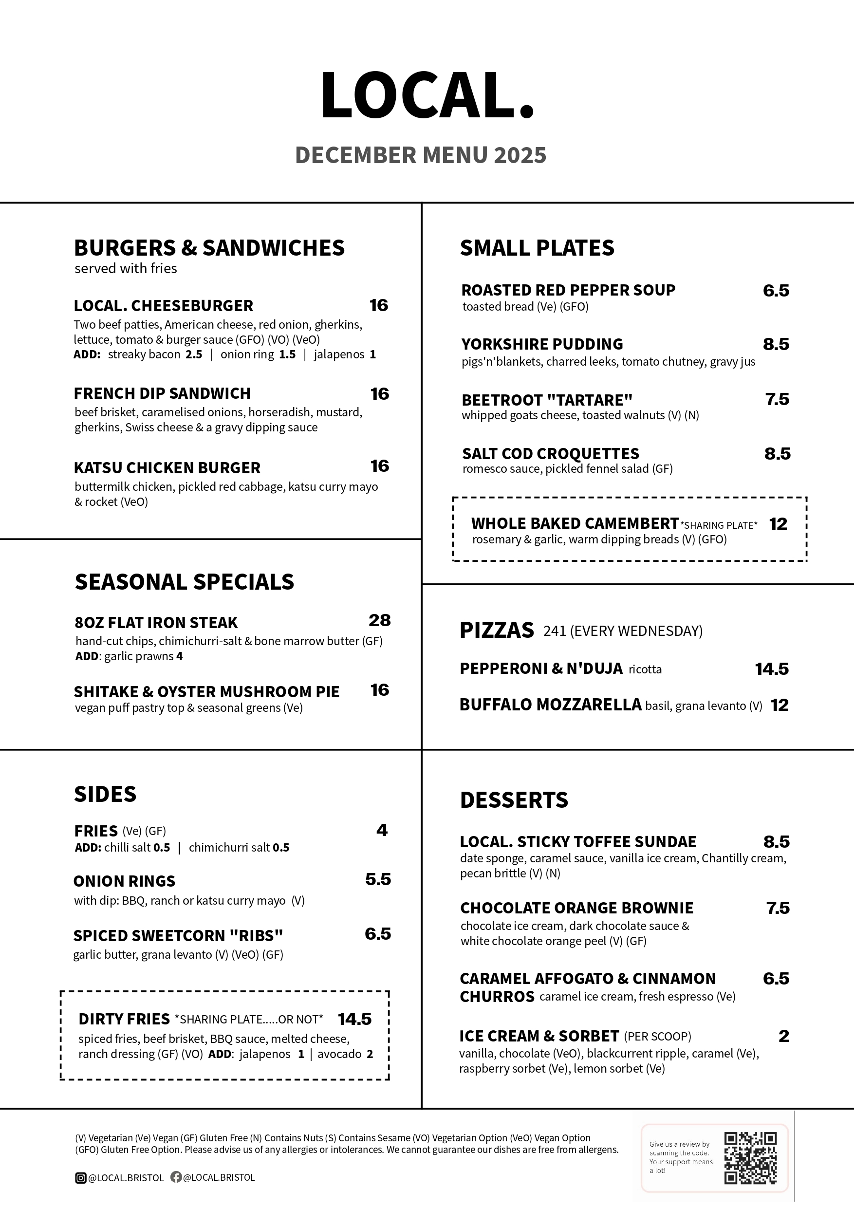 We are an independent bar that serves great food. We work with local breweries, distilleries and suppliers. Expect cold pints, strong cocktails, smooth coffee and seasonal food menus. Everything you want from your LOCAL.